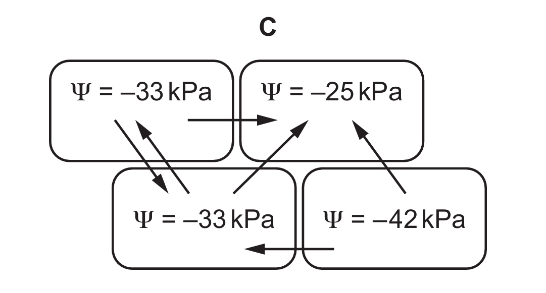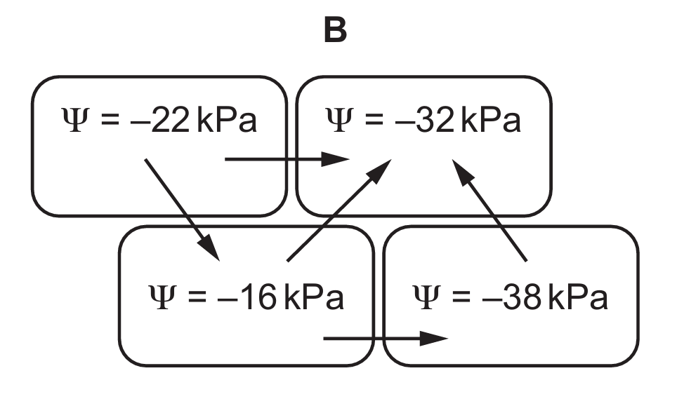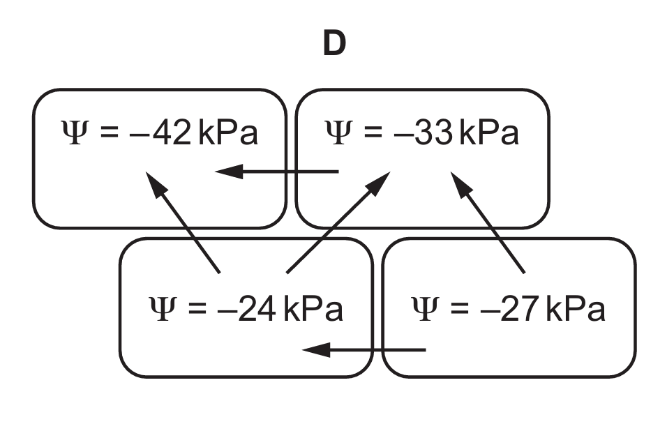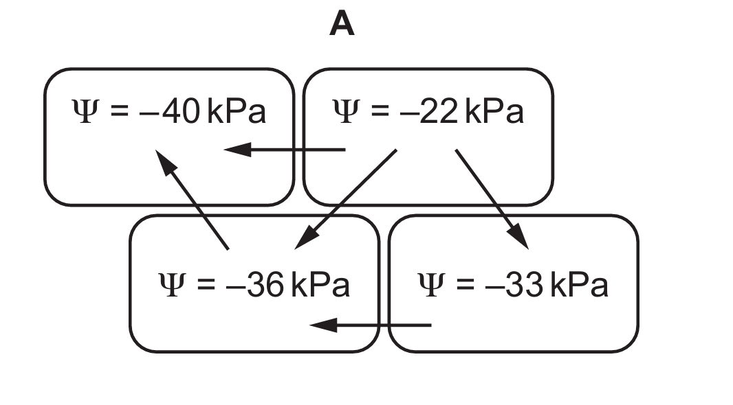 Water moves from higher (less negative) to lower (more negative) water potential. In option A, water correctly moves from -22 kPa (highest) to -40 kPa (lowest), with intermediate flows between -36 kPa and -33 kPa. Other options show incorrect flow directions against the potential gradient.