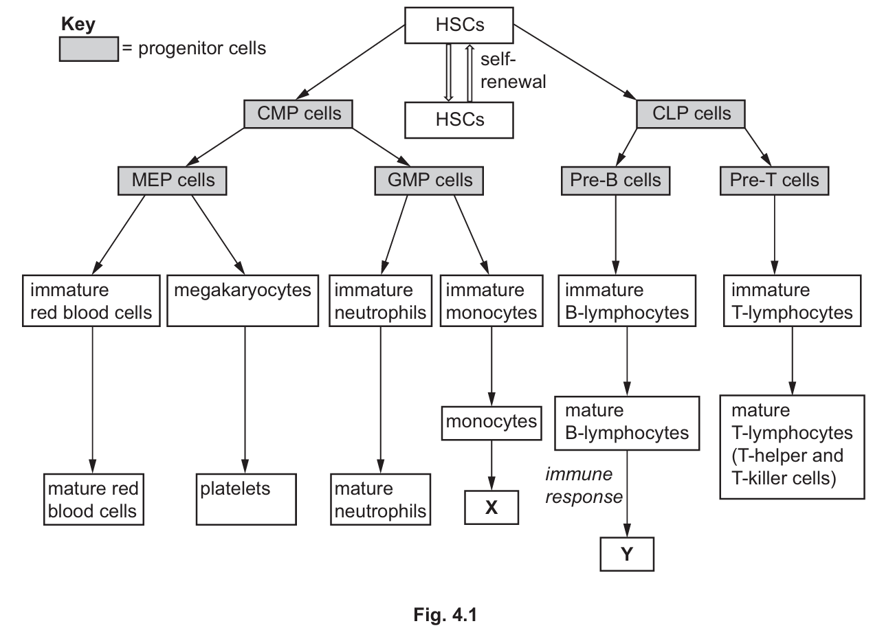 Fig. 4.1 is an outline summary showing the formation of some of the different types of blood cell that can be formed from HSCs. The first stage is the division of HSCs to produce progenitor cells. These cells are also able to divide by mitosis, but are not stem cells.