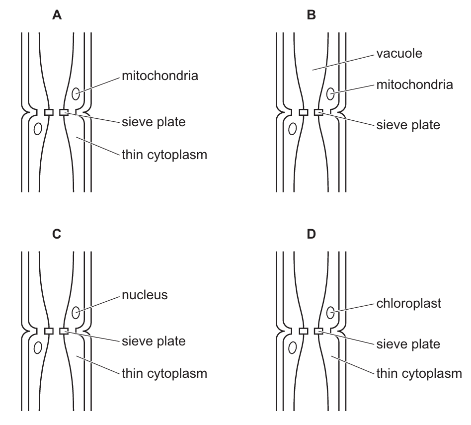 The structure described is a phloem sieve tube element, which contains mitochondria (for energy), sieve plates (for connection between cells), and thin cytoplasm (as most organelles degenerate). Nucleus (C) and chloroplasts (D) are absent in mature sieve tube elements.