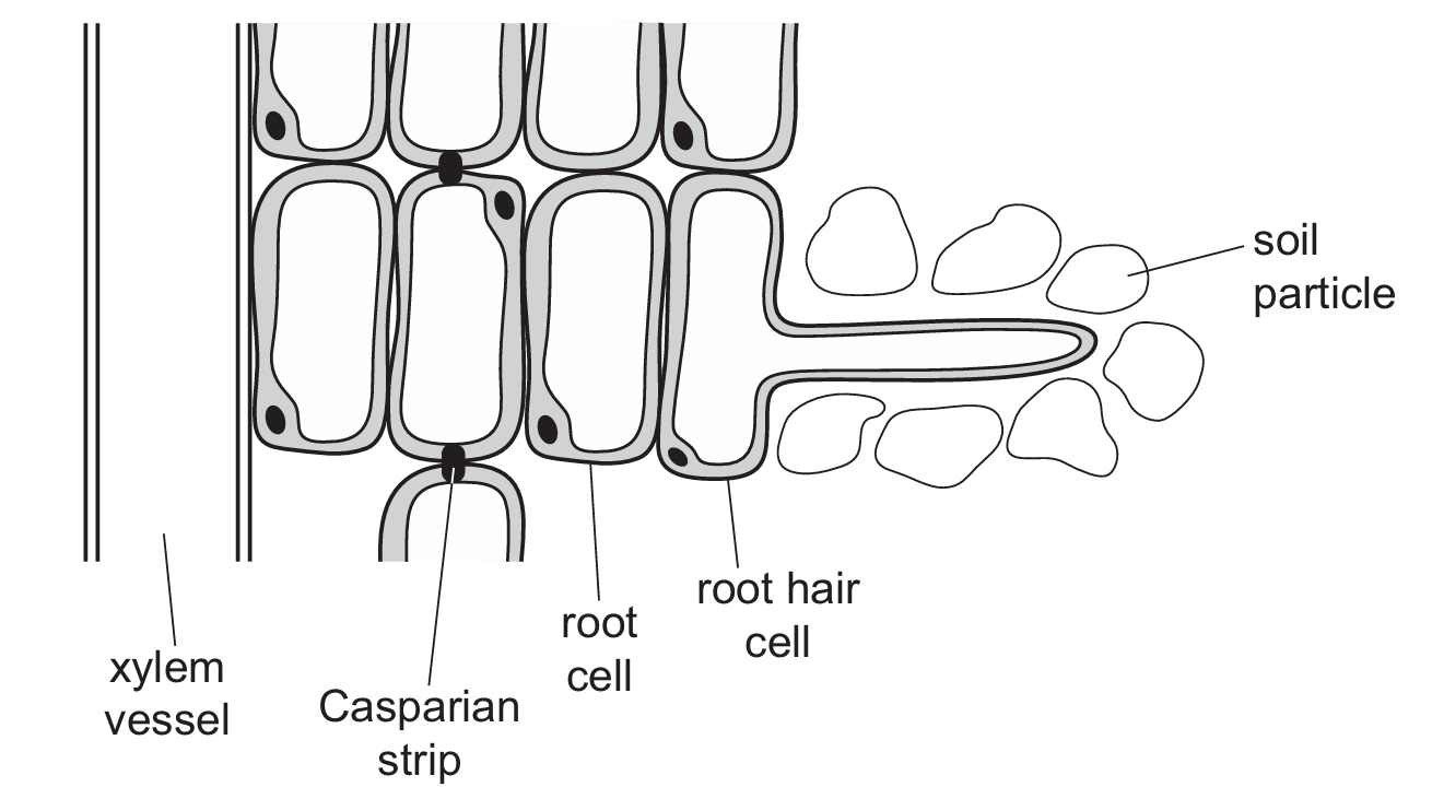 The Casparian strip, made of suberin, blocks the apoplast pathway in the endodermis, forcing water and solutes into the symplast pathway for selective uptake. This control point prevents unwanted substances from entering the xylem directly.