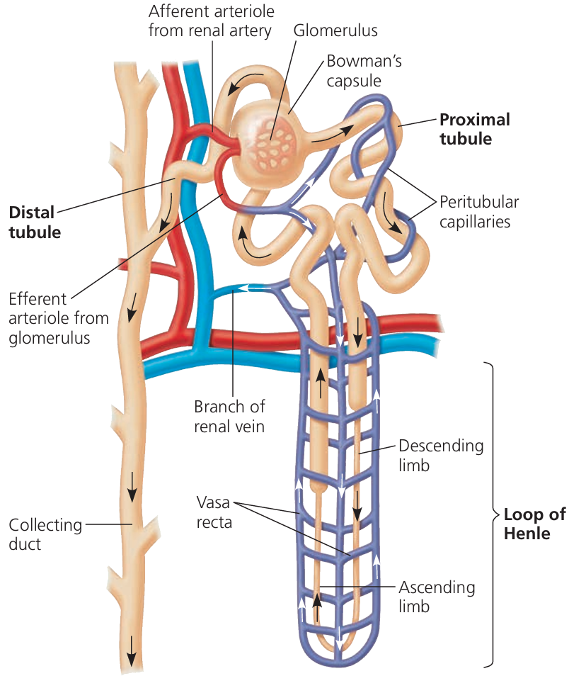 | Loop of Henle | Hairpin-shaped loop that concentrates urine by reabsorbing water and salts; has descending and ascending limbs. |