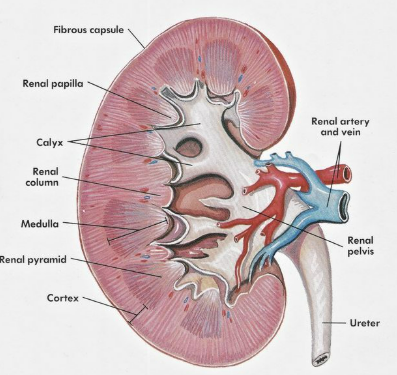 - describe the structure of the human kidney, limited to: fibrous capsule, cortex, medulla, renal pelvis, ureter, branches of the renal artery and renal vein