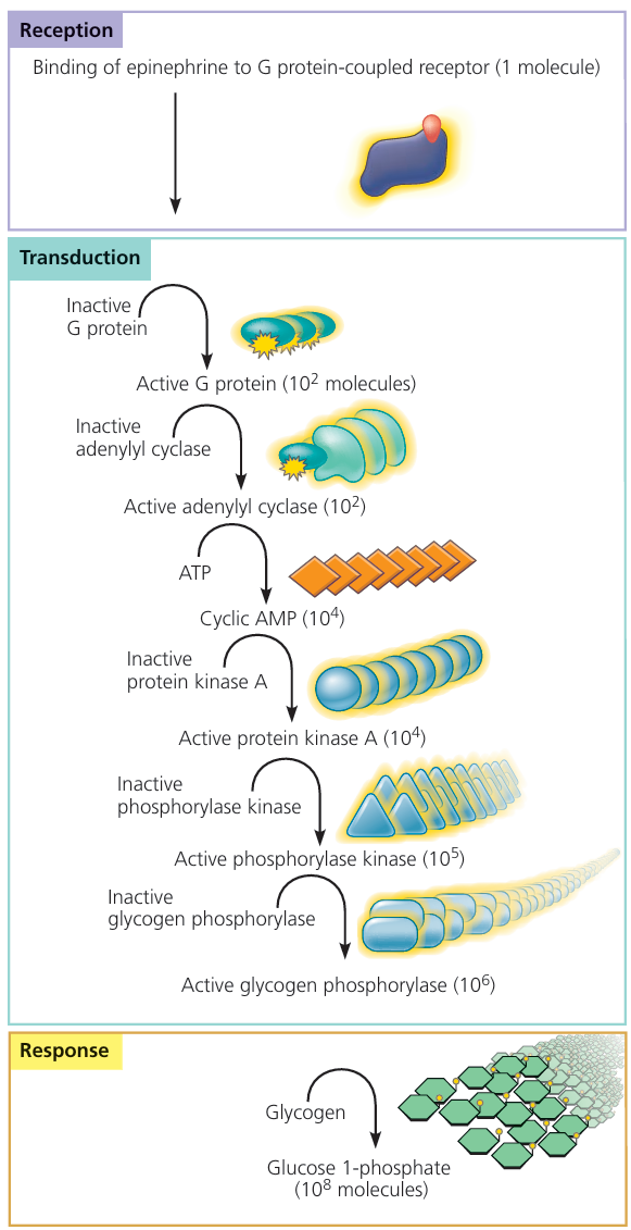 • amplification of the signal through the enzyme cascade as a result of activation of more and more enzymes by phosphorylation