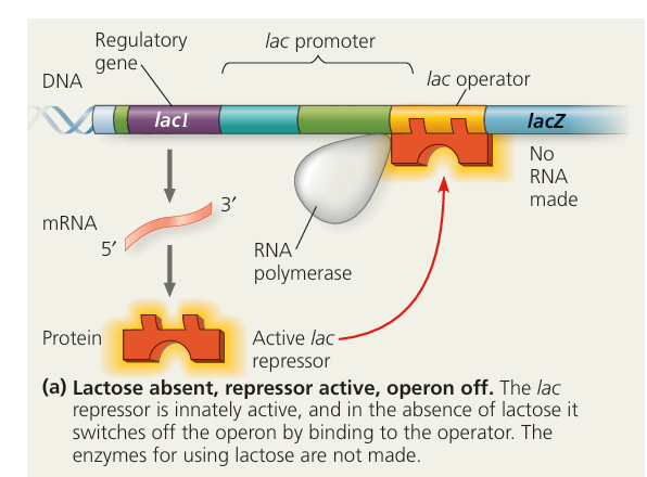 - The repressor (from lacI gene) binds to the operator.