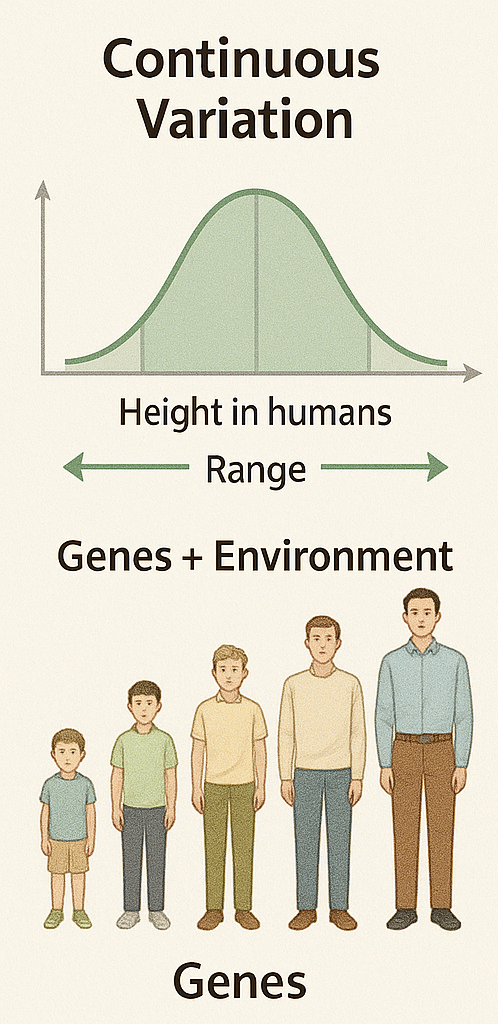 - Continuous variation: multiple genes → wide range of phenotypes → strongly affected by environment.