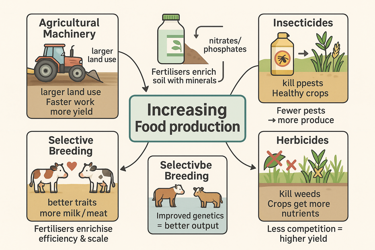 - Techniques include inbreeding, hybridisation, and selection for specific traits.