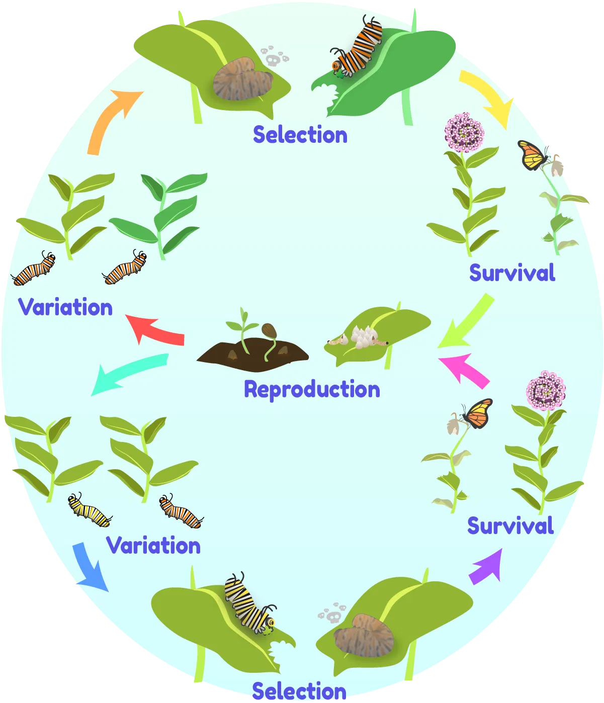 - Survival and reproduction of the fittest: Individuals with advantageous traits pass on their alleles to the next generation. Over generations, the population evolves with more individuals having advantageous traits.