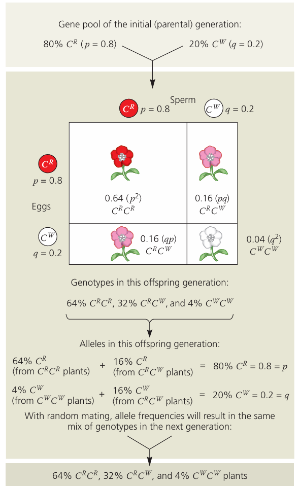 - use the Hardy–Weinberg principle to calculate allele and genotype frequencies in populations and state the conditions when this principle can be applied (the two equations for the Hardy–Weinberg principle will be provided, as shown in the Mathematical requirements)