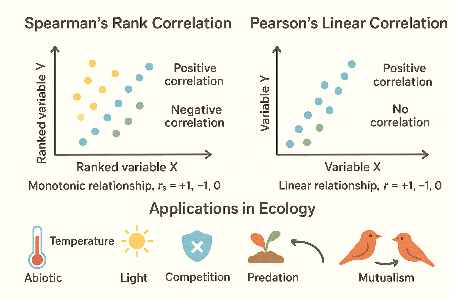 - use Spearman’s rank correlation and Pearson’s linear correlation to analyse the relationships between two variables, including how biotic and abiotic factors affect the distribution and abundance of species (the formulae for these correlations will be provided, as shown in the Mathematical requirements)