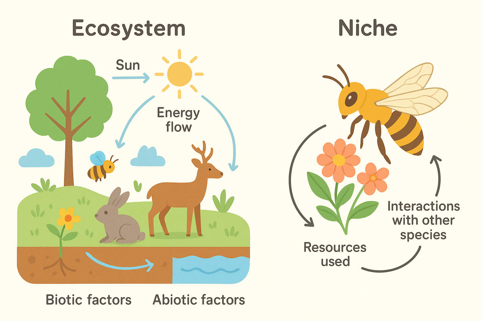| Niche | Role/function of a species in ecosystem | Bee pollination role |