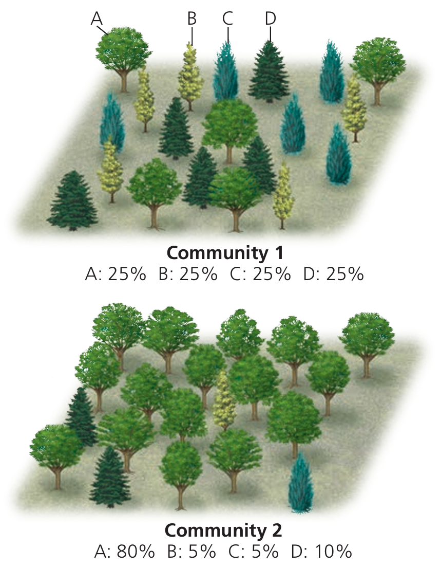- Example: A rainforest with 200 bird species vs. a desert with 20 bird species.