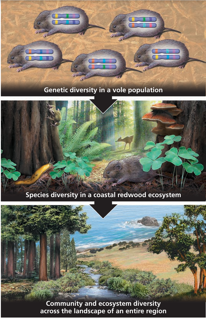 - explain that biodiversity can be assessed at different levels, including: