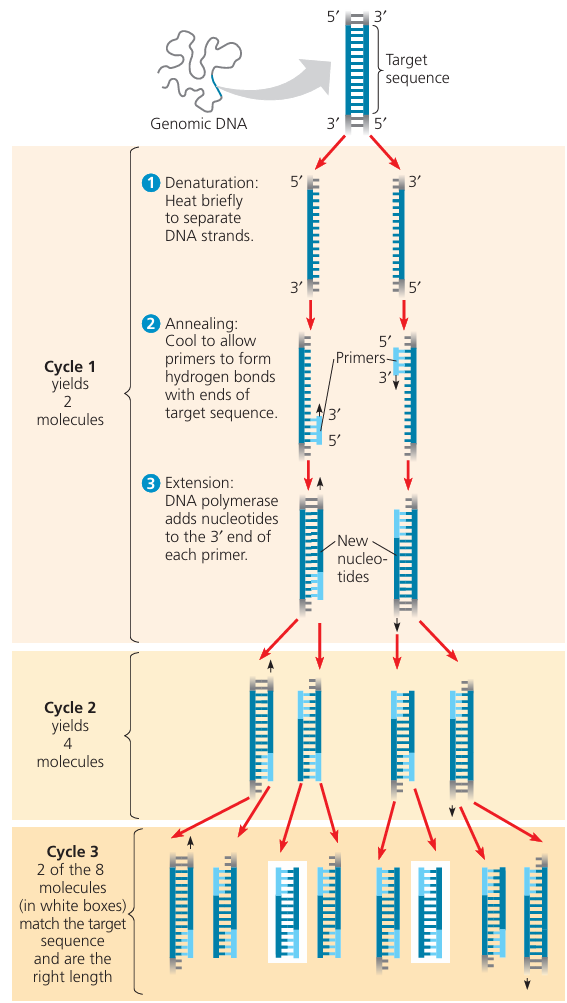 - describe and explain the steps involved in the polymerase chain reaction (PCR) to clone and amplify DNA, including the role of Taq polymerase