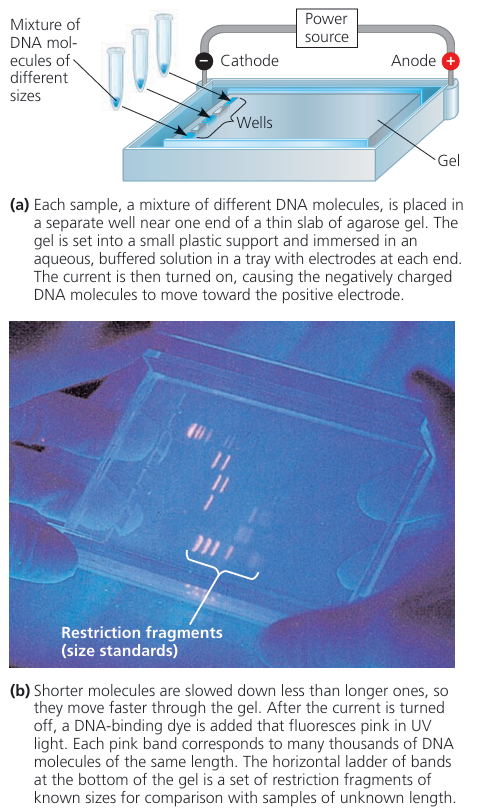 - describe and explain how gel electrophoresis is used to separate DNA fragments of different lengths