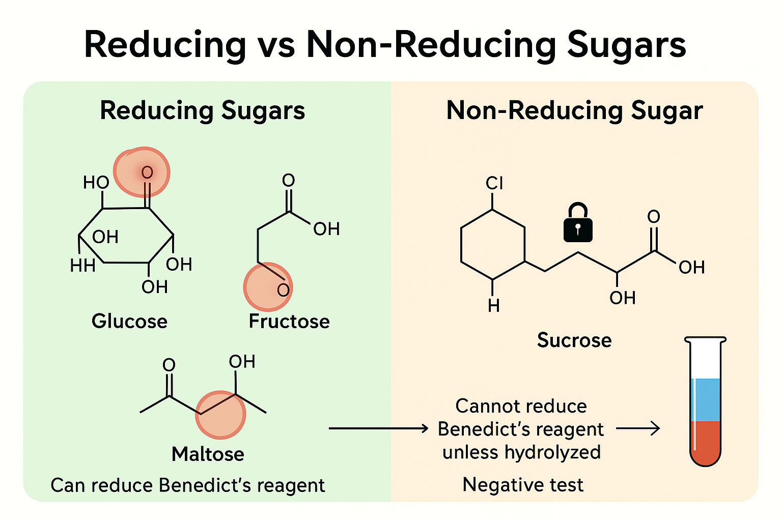 | Sucrose | Non-reducing | Glycosidic bond blocks reactive group |