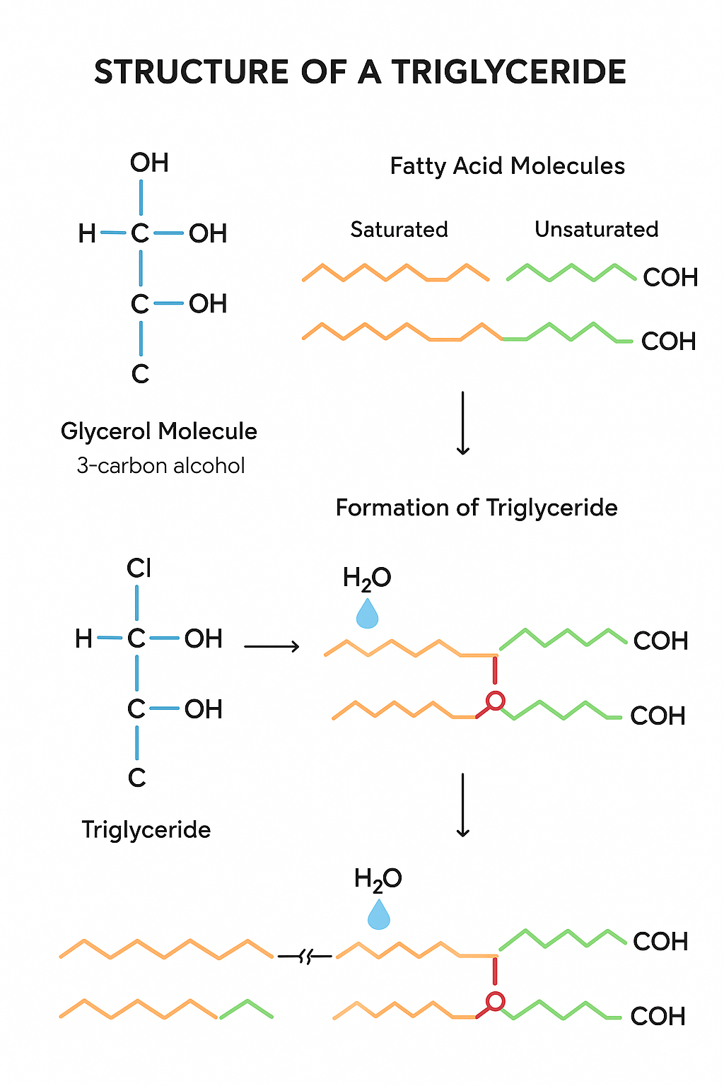 - state that triglycerides are non-polar hydrophobic molecules and describe the molecular structure of triglycerides with reference to fatty acids (saturated and unsaturated), glycerol and the formation of ester bonds