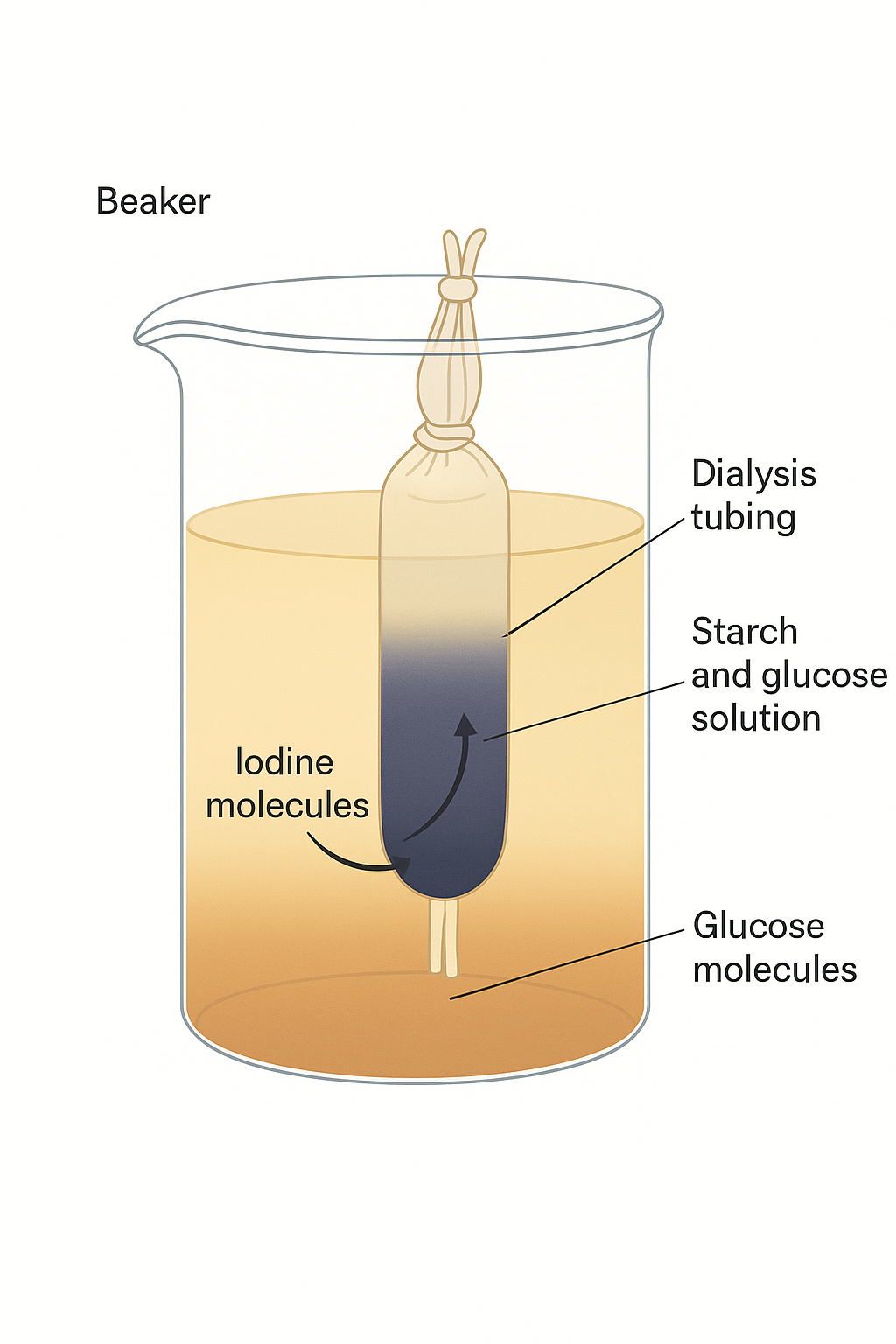 - Materials: Dialysis tubing, starch solution, glucose solution, water, iodine solution, Benedict’s reagent.