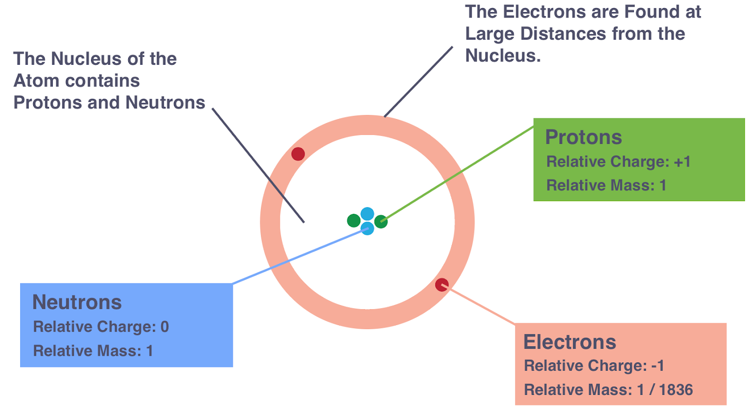 - Electrons have a relative charge of -1 and a very small relative mass of \( \mathrm{\tfrac{1}{1836}} \approx 0.0005 \).