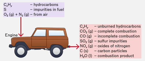 recognise the environmental consequences of carbon monoxide, oxides of nitrogen and unburnt hydrocarbons arising from the combustion of alkanes in the internal combustion engine and of their catalytic removal