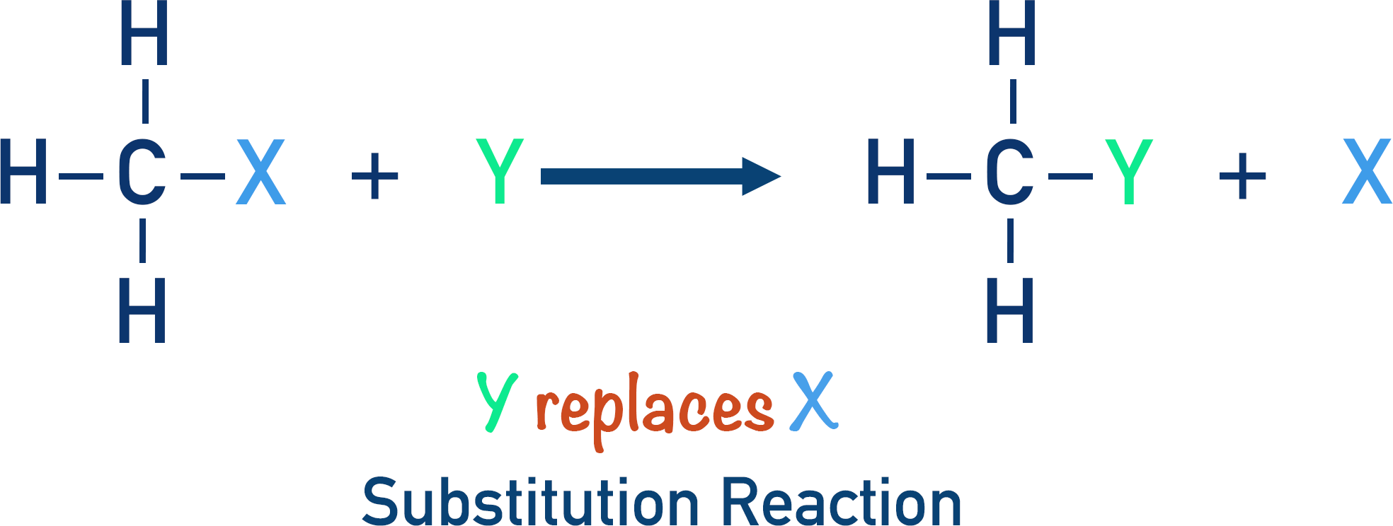 Free-radical substitution is a reaction mechanism in which a hydrogen atom in an alkane is replaced by another atom (usually a halogen) via a chain reaction involving free radicals.