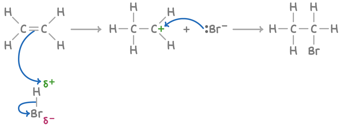 describe the mechanism of electrophilic addition in alkenes, using bromine/ethene and hydrogen bromide/propene as examples