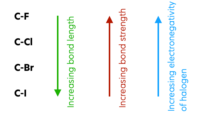 As the halogen atom increases in size down Group 17, the C–X bond length increases and the C–X bond strength decreases.