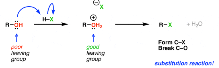 \( \mathrm{ROH + HX \rightarrow RX + H_2O} \)