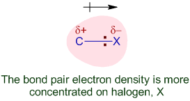 The halogen is more electronegative than carbon, making the carbon atom electron deficient and susceptible to nucleophilic attack.