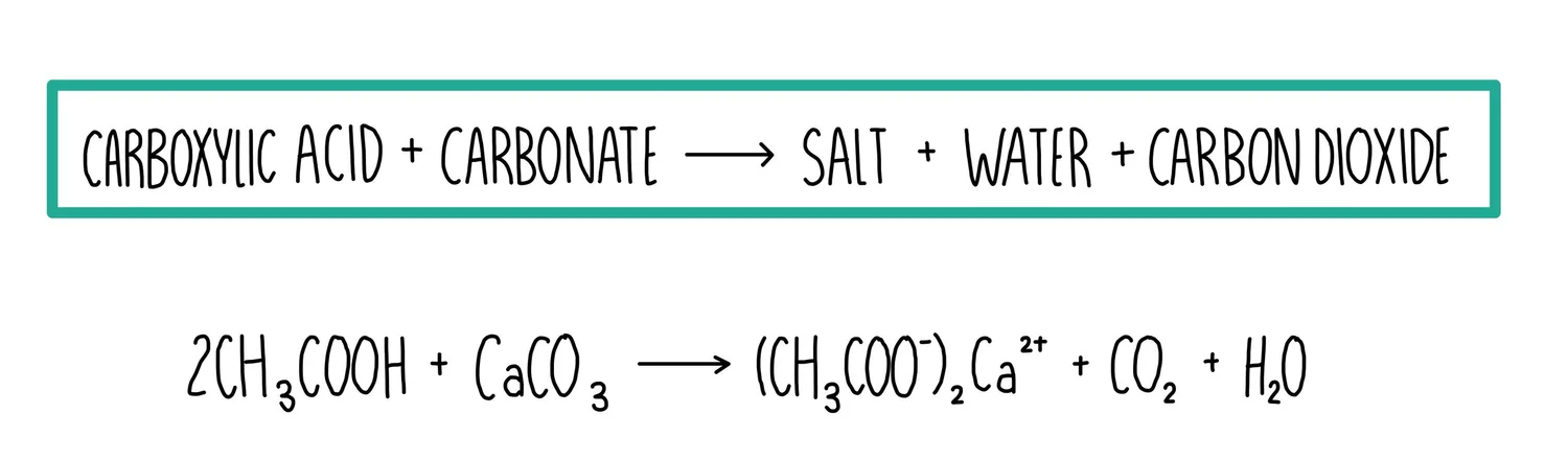 Carboxylic acids react with carbonates or hydrogencarbonates in an acid–base reaction to produce a salt, water and carbon dioxide gas.