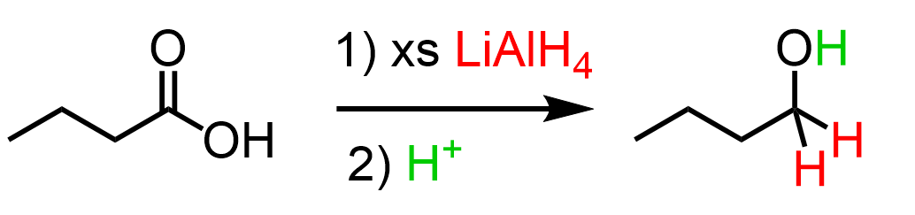 General equation: \( \mathrm{RCOOH \rightarrow RCH_2OH} \)