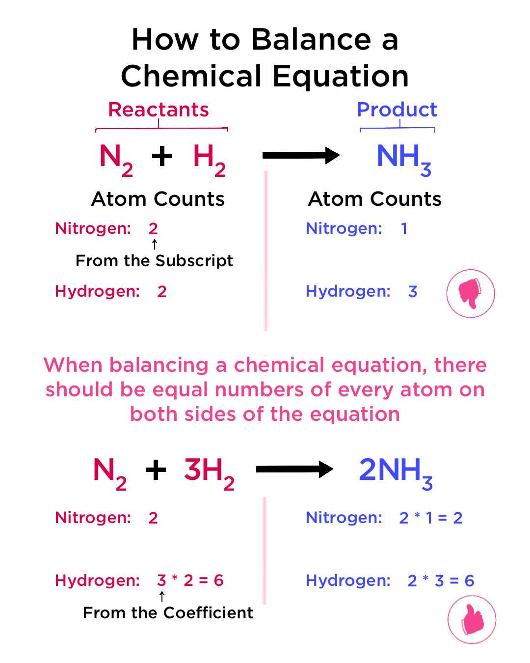 A balanced equation has the same number of each atom on both sides. Coefficients are adjusted; formulas must NOT be changed.