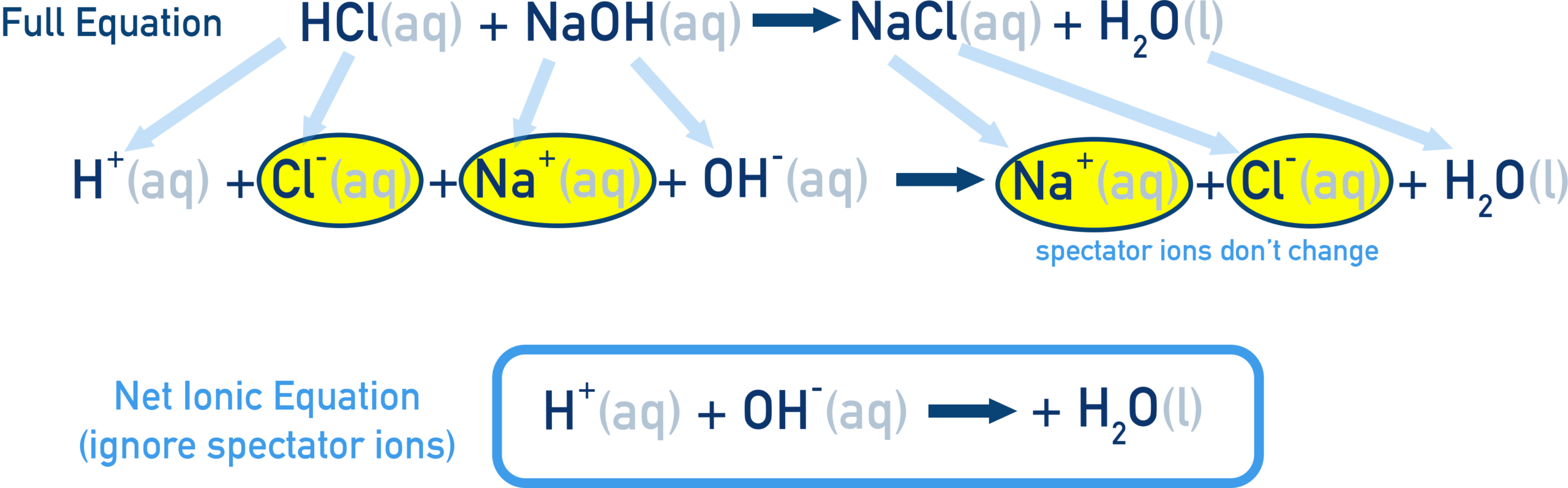 - Write full ionic form (split aqueous ionic compounds into ions).