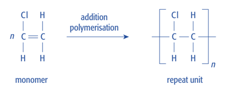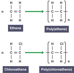 describe addition polymerisation as exemplified by poly(ethene) and poly(chloroethene), PVC