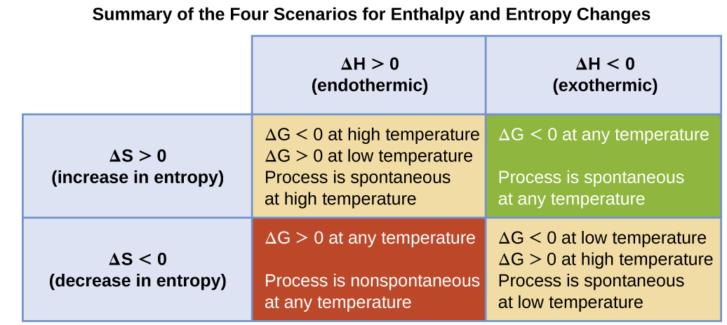 | \( \mathrm{\Delta H^\circ < 0} \) | \( \mathrm{\Delta S^\circ > 0} \) | Feasible at all temperatures |