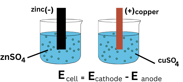\( \mathrm{E^\circ_{cell} = E^\circ_{cathode} – E^\circ_{anode}} \)