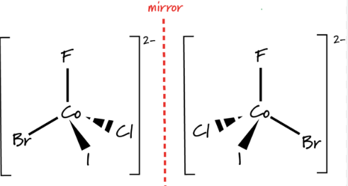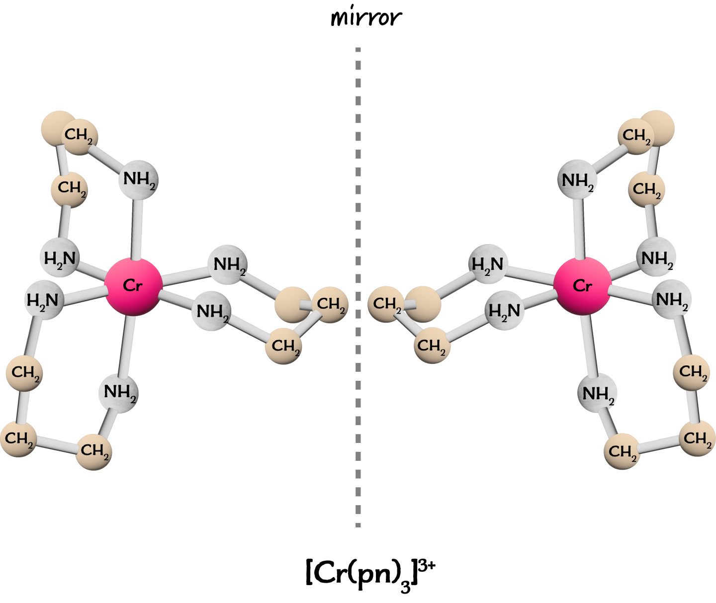 This complex exists as two optical isomers that are mirror images and cannot be superimposed.