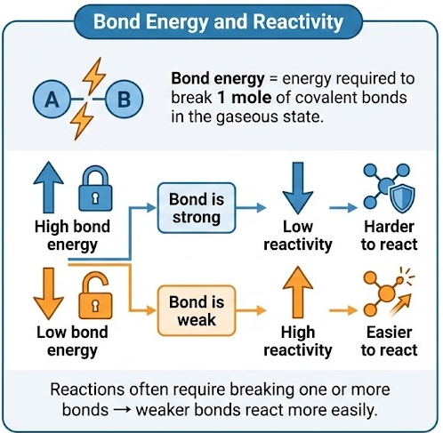 The reactivity of a covalent molecule depends strongly on the strength and length of its bonds. Bond energy tells us how much energy is needed to break a bond, while bond length shows how close the bonded nuclei are. Together, these determine how easily a molecule reacts.