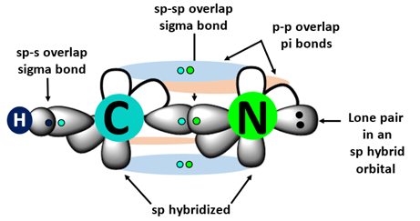 σ bonds: – \( \mathrm{sp – sp} \) between C and N – \( \mathrm{sp – 1s} \) between C and H