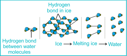 | Ice less dense than water | Hydrogen bonds create an open hexagonal lattice with large spaces → lower density. |