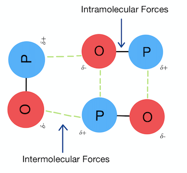The bonds holding atoms together within a substance (ionic, covalent, metallic) are generally much stronger than the forces that act between molecules (intermolecular forces such as London forces, pd–pd forces and hydrogen bonding).