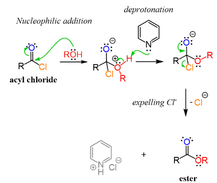 \( \mathrm{RCOCl + R’OH \rightarrow RCOOR’ + HCl} \)