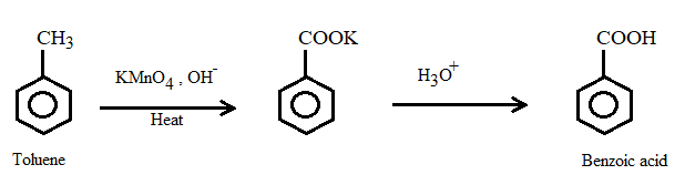 Benzoic acid can be produced by the oxidation of an alkylbenzene. You must be able to recall the reagents and conditions for this reaction, as exemplified by the conversion of methylbenzene into benzoic acid.