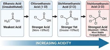 Chlorine-substituted carboxylic acids are more acidic because chlorine withdraws electron density by an inductive effect, stabilising the carboxylate ion.