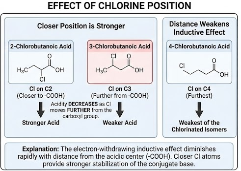 Chlorine atoms closer to the –COOH group have a greater acid-strengthening effect.