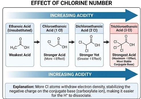 Chlorine-substituted carboxylic acids are stronger acids than unsubstituted carboxylic acids. You must be able to describe and explain how the number and position of chlorine atoms affect acidity.