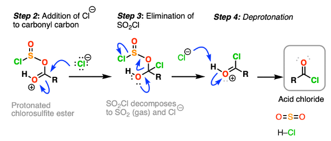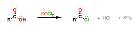 \( \mathrm{RCOOH + SOCl_2 \rightarrow RCOCl + SO_2 + HCl} \)