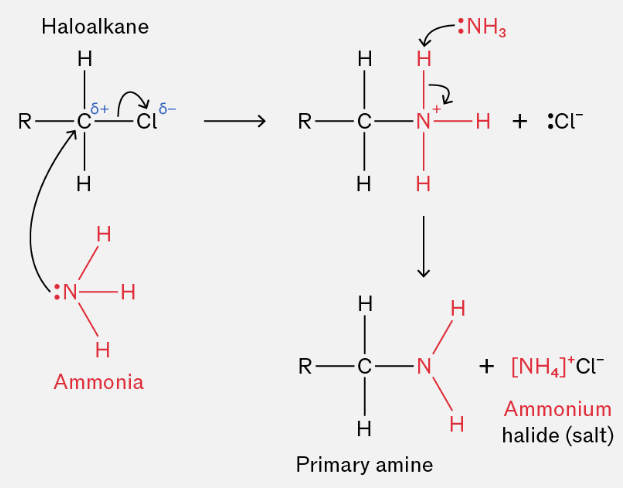 - halogenoalkane + NH₃ → primary amine