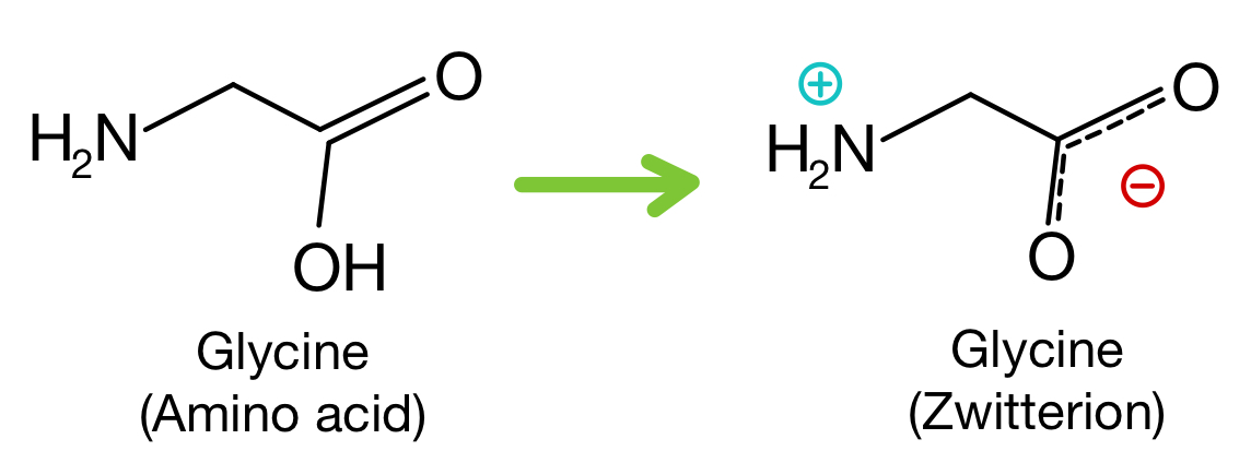 A zwitterion contains both a positive and a negative charge within the same molecule: