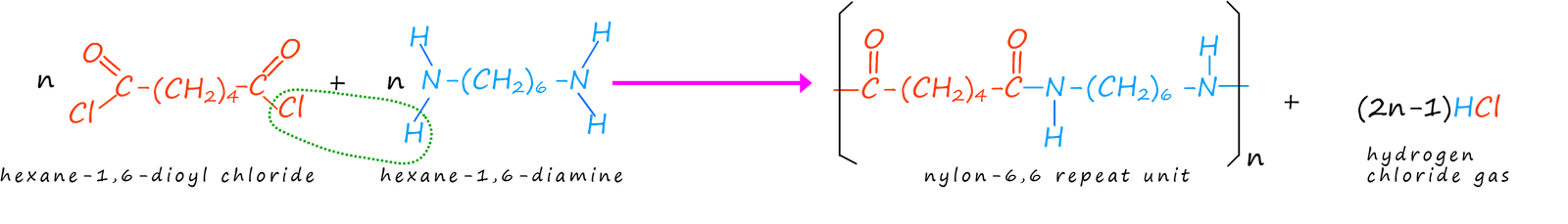A diamine reacts with a dicarboxylic acid to form a polyamide.