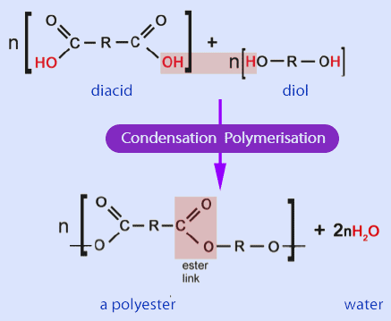 Polyesters are formed by condensation polymerisation reactions that produce ester linkages (–COO–). You must be able to describe how polyesters are formed by two different routes and identify the reagents, conditions and repeating units.